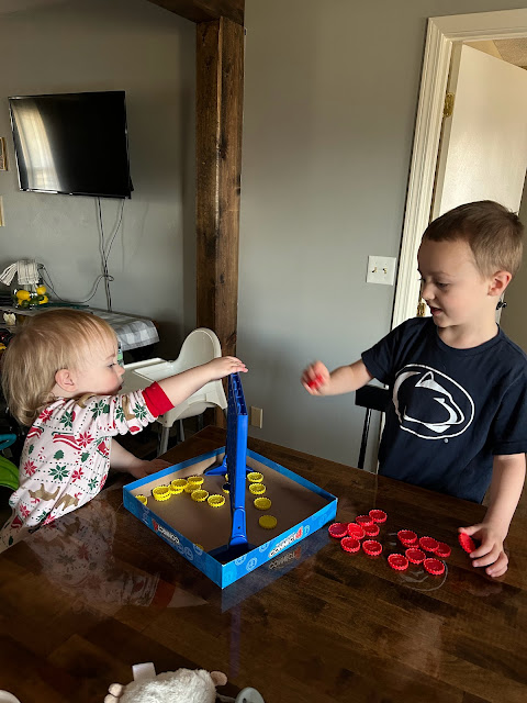 Wells really wants Candyland, so I got that for them to share. I think he has played it at school. They are doing more cooperative play these days at home so here we are. Connect 4 kept them busy all weekend. Board games are something else I don't like buying because they take up storage space and require maintenance (putting them back together correctly). Like, these Connect 4 pieces ultimately ended up being thrown and flicked off the table, stacked into towers, and carried around in a play shopping cart. I had to count them to put them away.
