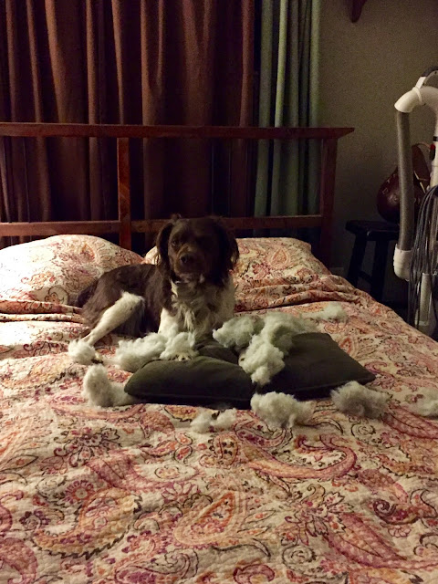 Jett started destroying this pillow (he got in so much trouble) and then Scout finished the job.