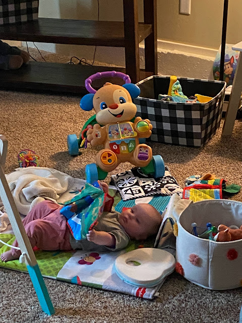 Her own blanket, her own toy, her own jacket. Still Wells' stroller though.